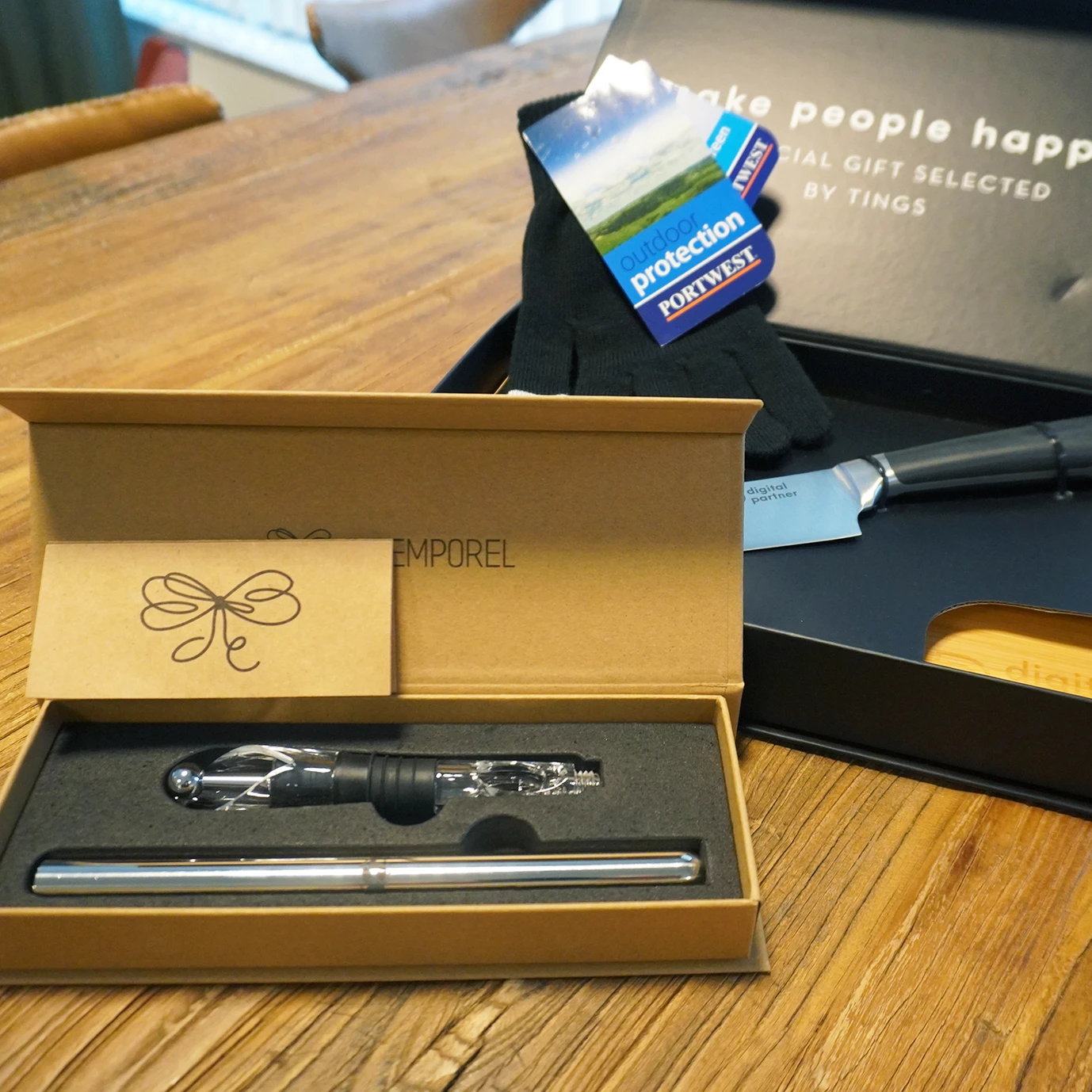 Priset inkluderar en exklusiv vinkylningsstav med tillhörande hällpip och propp, en kockkniv med matchande skärbräda samt ett par vantar med fingertoppar anpassade för touchskärmar.